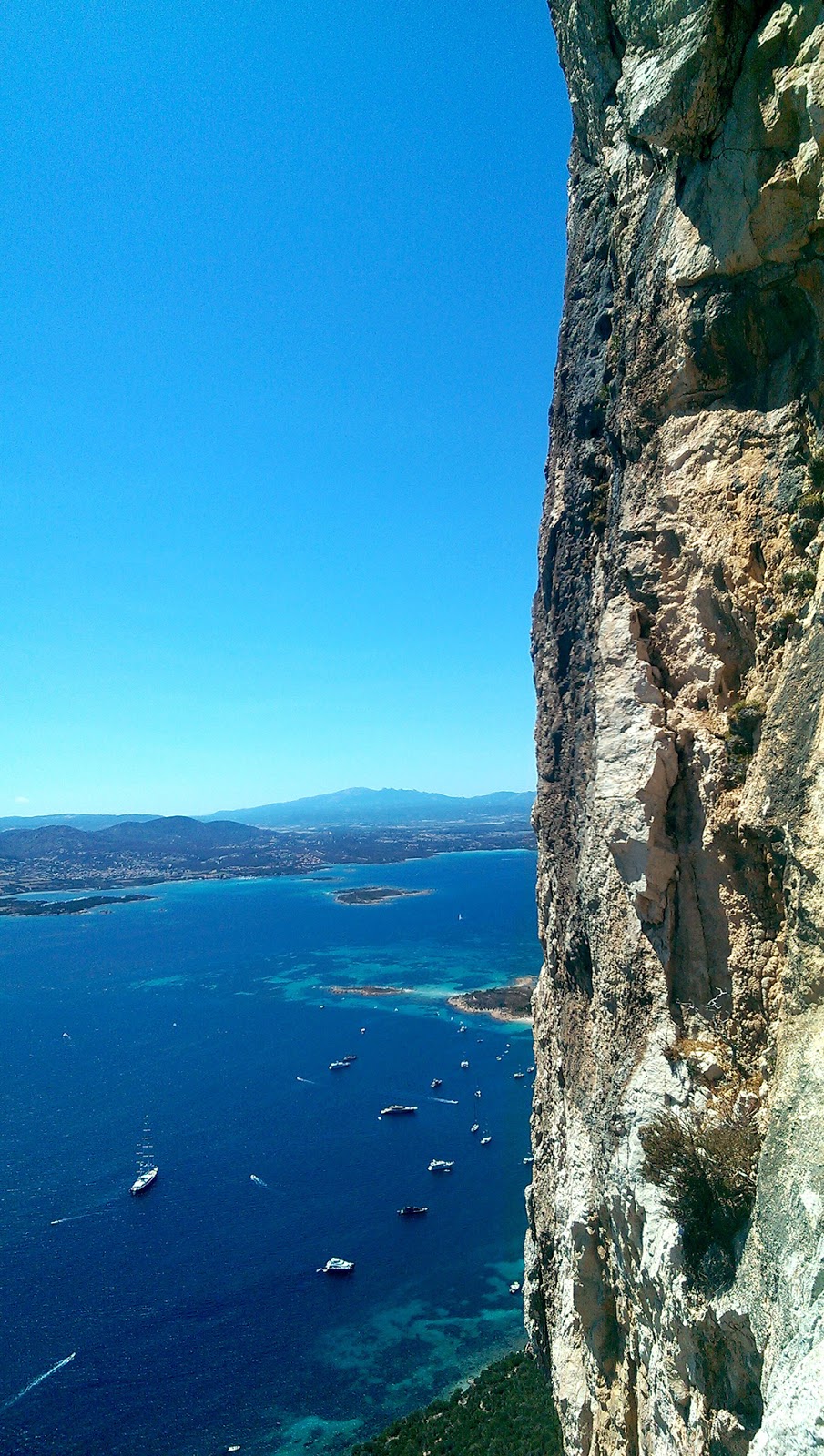 A jak komuś za mało wrażeń, to może się na Tavolarę wspiąć po via ferrata (czyli te takie żelazne liny, haki i uprzęże na pionowej skale) Via degli Angeli. Tavolara ma tylko 560 m n.p.m. ale jak się jest bezpośrednio nad morzem, na poziomie zero, to te 560 m to jest naprawdę sporo. A dodajmy do tego te 45°C i mamy proszę państwa piekło.